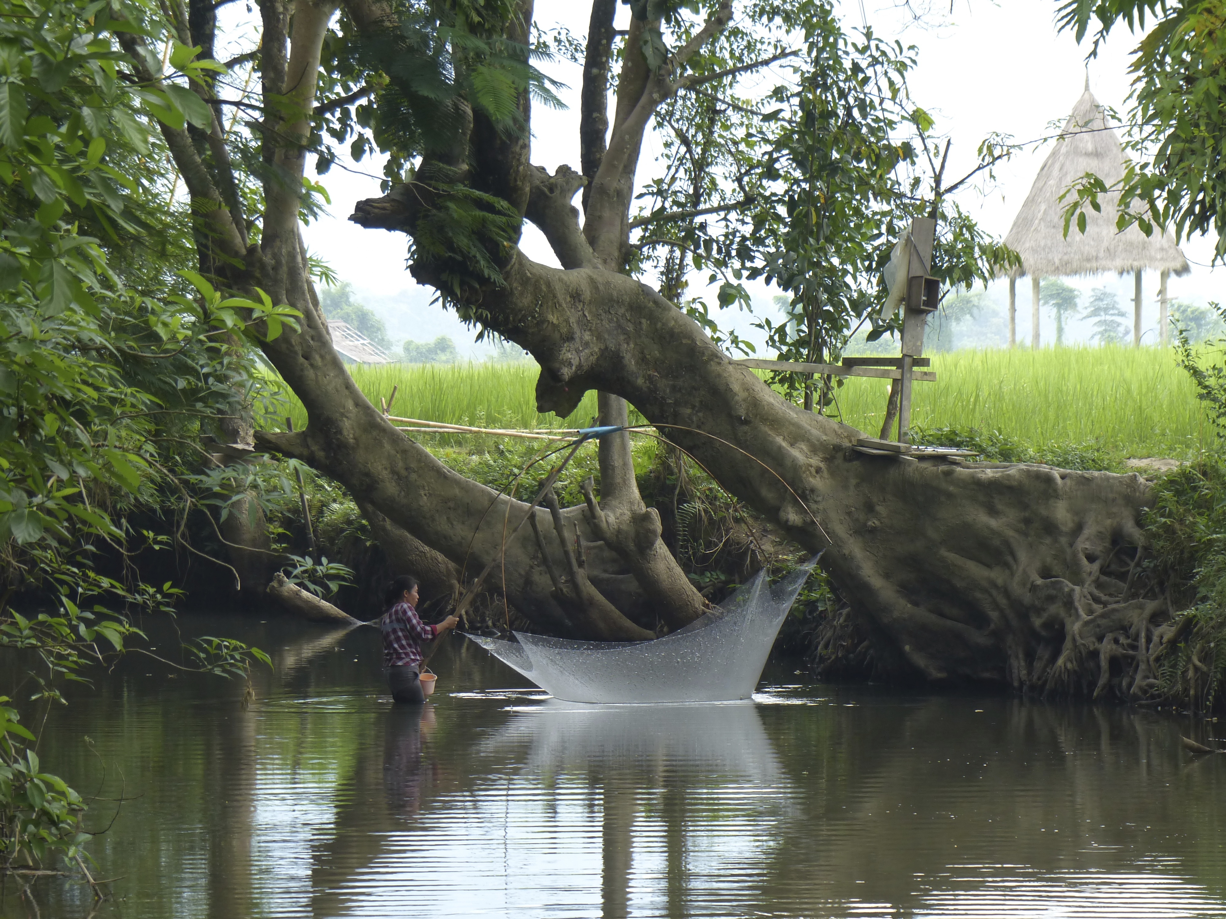 Right across the river from our hotel is an entryway into wild country. A few Hmong villages out there but mainly rice fields surrounded by limestone hills. We rented bikes and crossed the bridge to explore. 6 kilometers away there was a sign pointing us in the direction of a cave. After a few kilometers of what seemed like straight up to me, we rode our bikes as far as we could go to the edge of a rice field. After crossing the rice field and a tricky bamboo bridge we found our cave. The cave was not much to speak of but the journey there was amazing. On our way back we passed a mountain garden full of wonderful fruit. Guava, bananas, and also soybean were growing there and being very well tended. As we came down from the cave into the rice fields Michel interacted with the young couple working the fields. The woman invited him into her small open hut and demonstrated her meal preparation.
