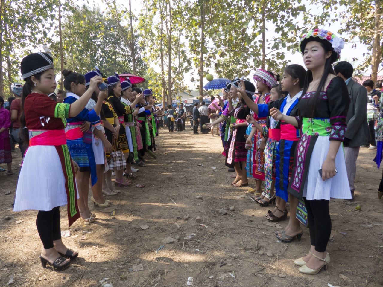 As we wandered farther into the fair we saw beautifully dressed young people standing in rows and tossing balls back and forth to each other. I learned later this is a courtship ritual. Tossing the ball back and forth is a way of proving that you can work together. Also, the ball is tossed at a relaxed rhythm and leaves plenty of time for making conversation with a potential husband or wife. In fact, there were hundreds of people standing in lines and tossing small balls back and forth.