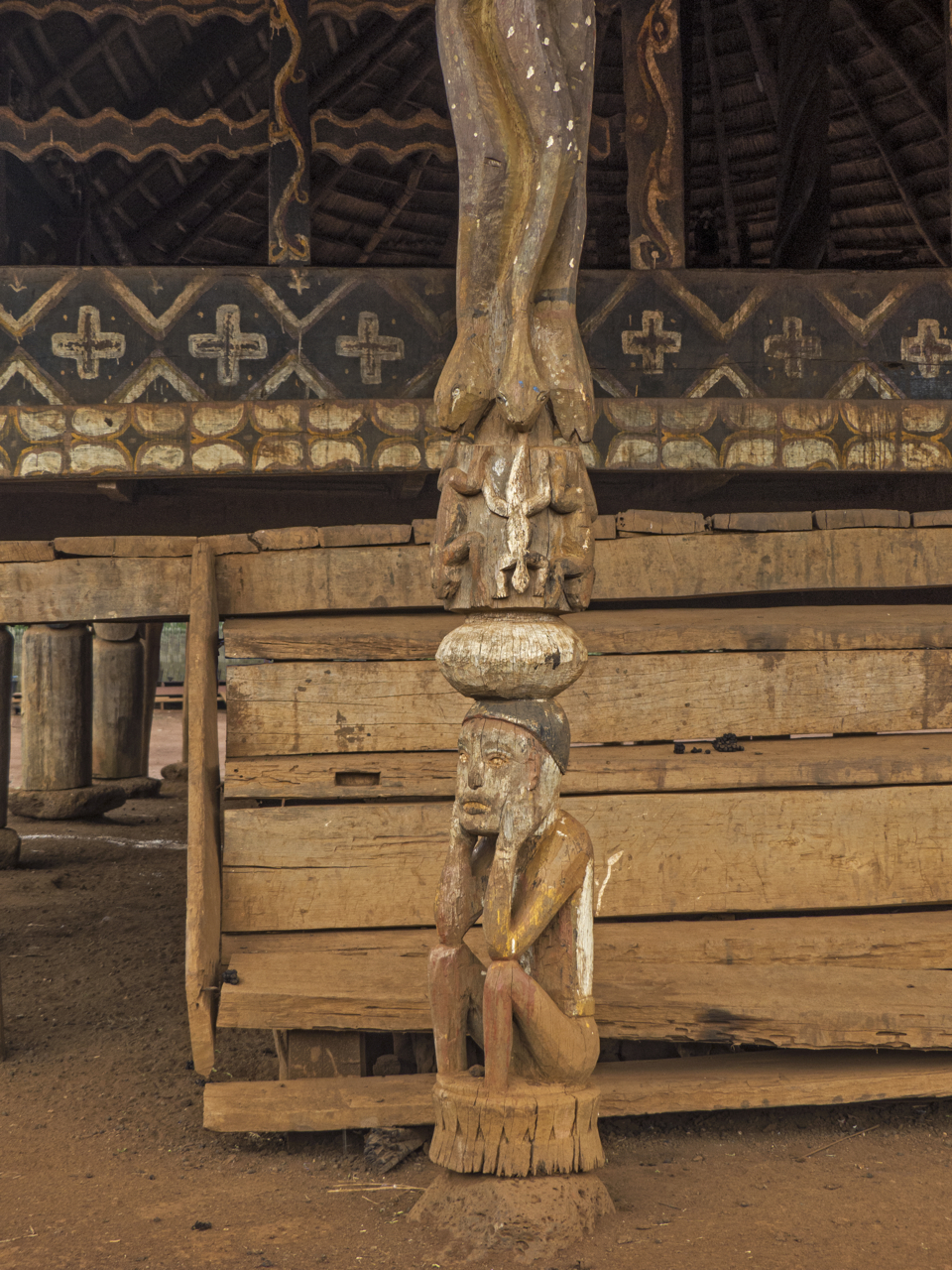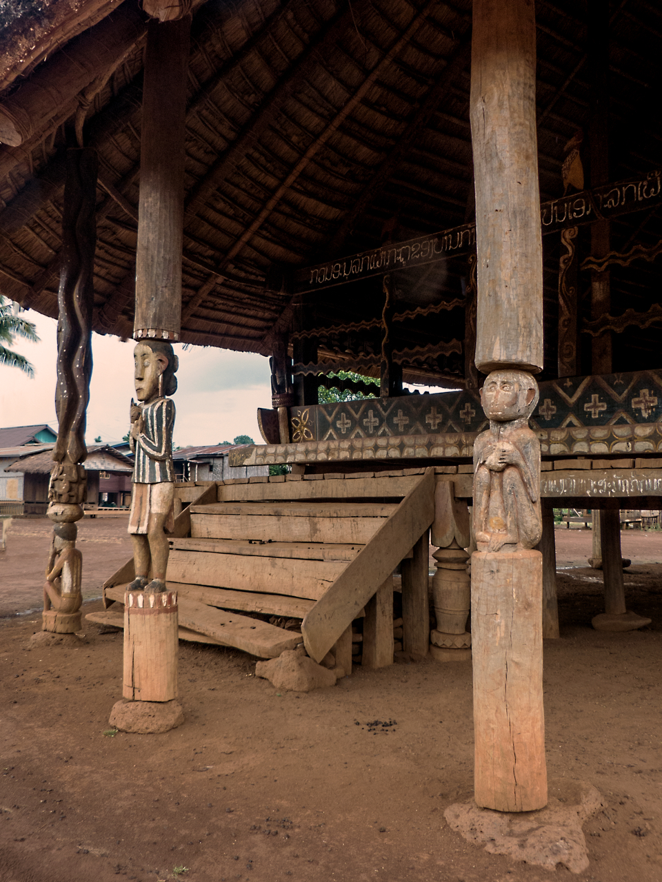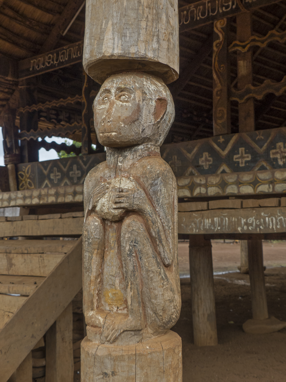 Eventually we made our way to the community house. The community house is in the center of the village and all Katu villages are styled in the same way. This particular structure had been moved from the previous village to Ban Kandon making it very old except for the thatched roof which was recently redone. All markings on the community house have meaning.