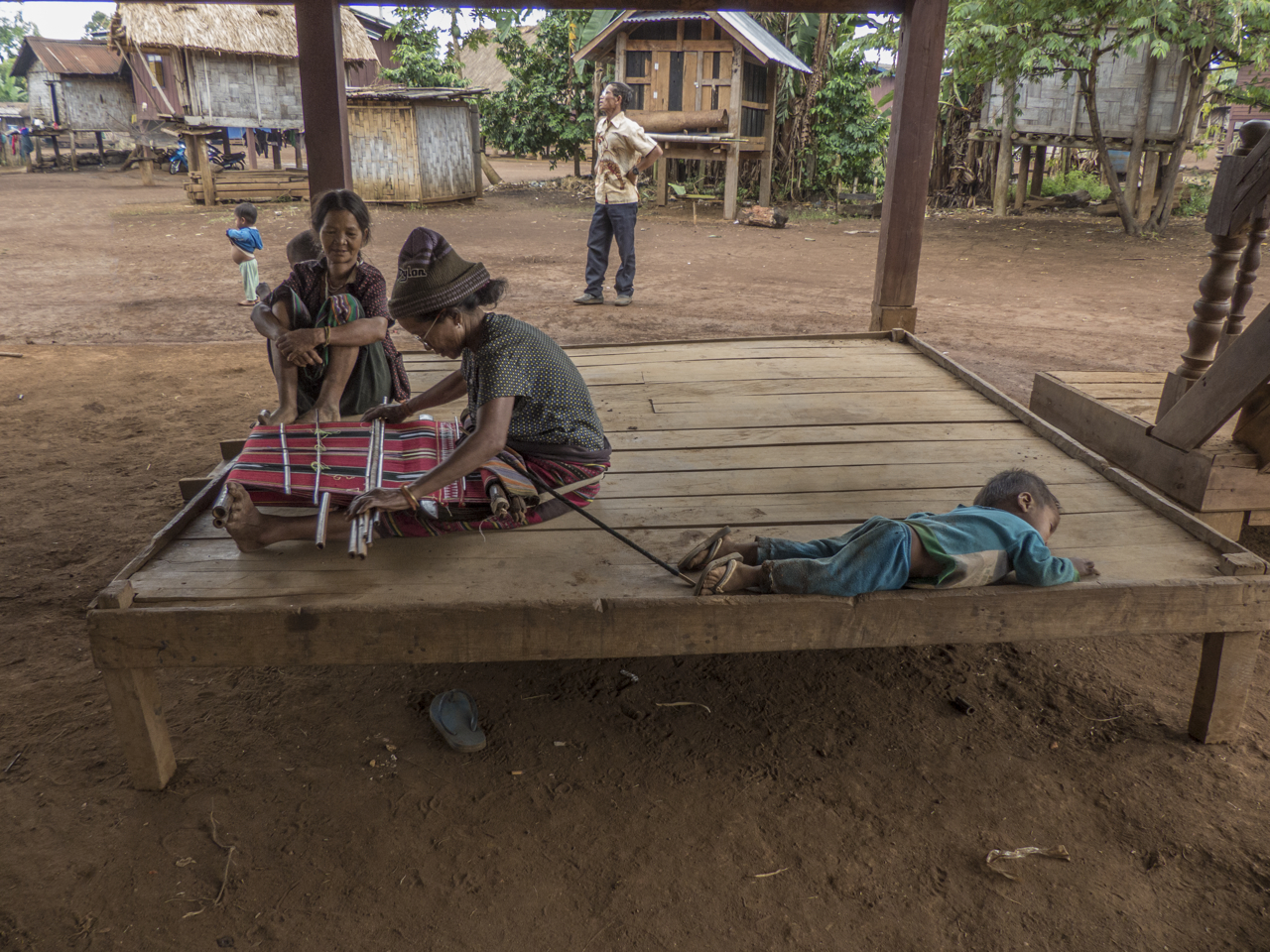 Many of the women were weaving. The women weave the story of the Katu people into their fabrics. Women begin weaving at 10 years old.