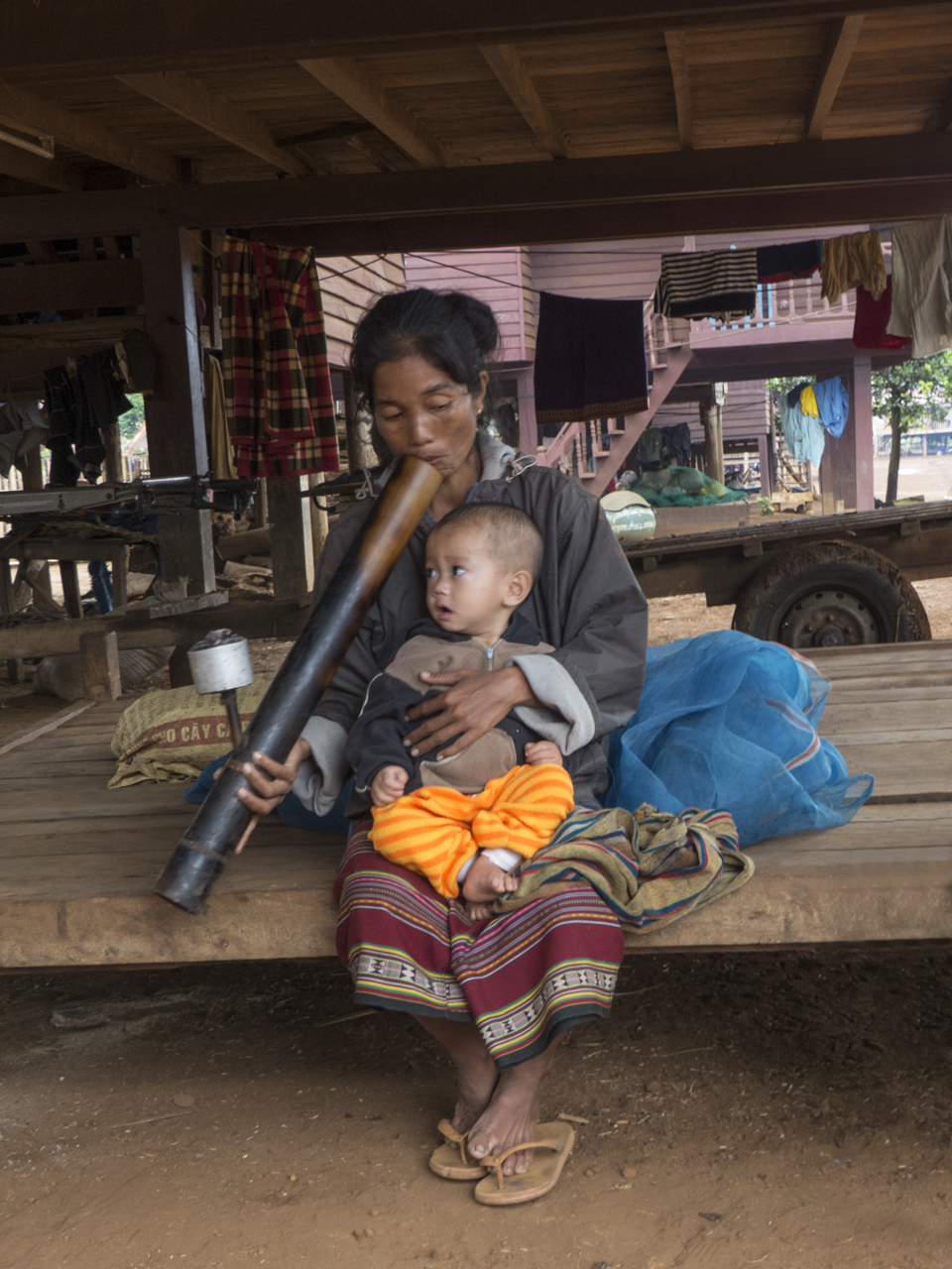 Most of the villagers were not working in the fields and were sitting underneath or around their homes smoking tobacco in Katu water pipes. All Katu people smoke tobacco, which they grow themselves, even the very young. They consider smoking from the Katu pipe to be a natural way to improve health and relax.