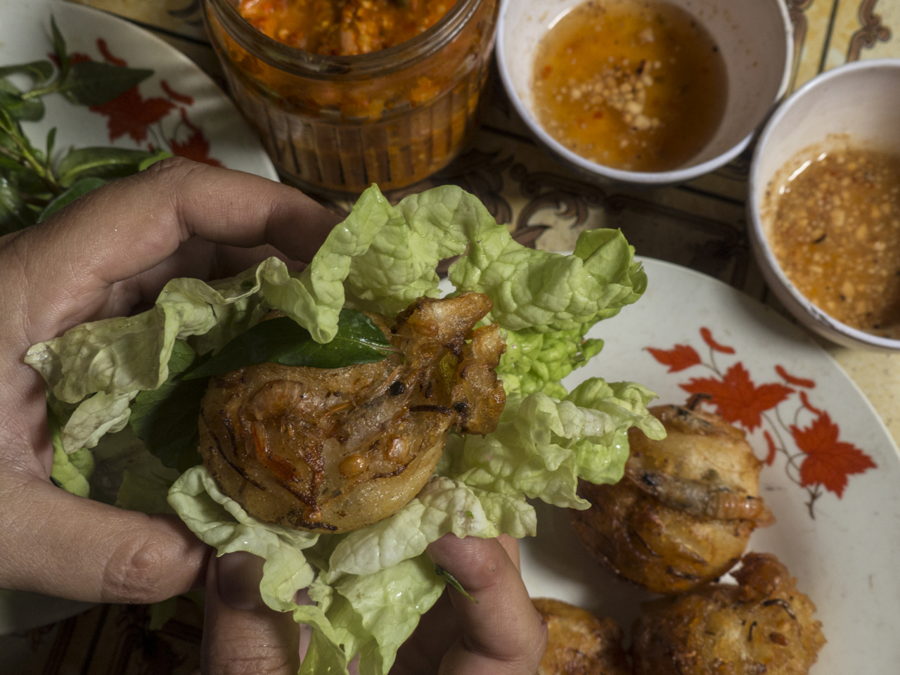 We discovered these tasty fried shrimp cakes which are dipped in a spicy sweet sauce. Wrap them in lettuce, dip in the sauce, and take a bite. The woman who cooks them stands right in front of you as you eat. 5 shrimp cakes cost about .50 cents. When Michel asked to take her picture she demanded a dollar which is why you won’t see her picture here. The women vendors in the market are tough and negotiation is often required when a barang (foreigner) is buying anything.
