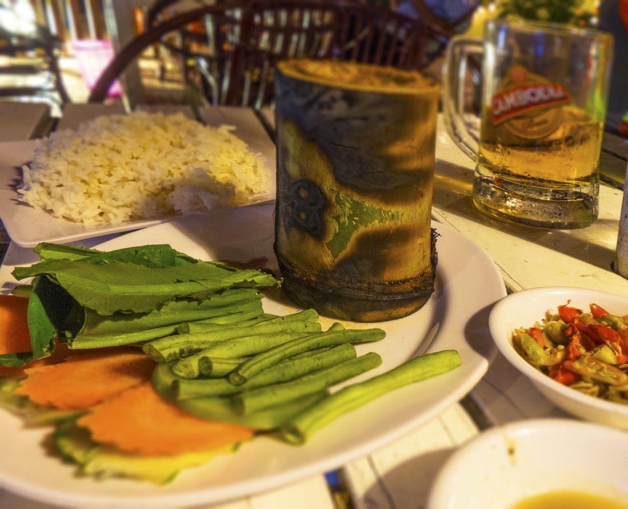 Right next to the old market are some outdoor restaurants across the street from the river. One of them was recommended for a couple of excellent dishes. The first is The Beef in the Bamboo. This beef is slow cooked in the bamboo with herbs and what I assume is a lite bamboo sauce. The result is tender beef with a subtle yet tangy sauce. Pour the concoction over rice or dip the veggies in it and you are in heaven.