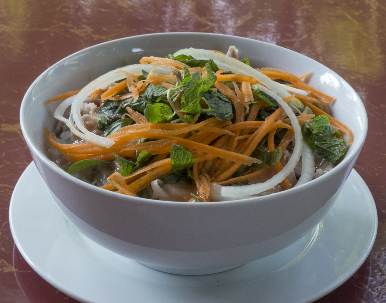 Chicken and minced fresh banana flower salad. The banana flower is cut very thin and mixed with lime, steamed carrots, peanuts, green beens, and a few red peppers sliced thin. Refreshingly good.