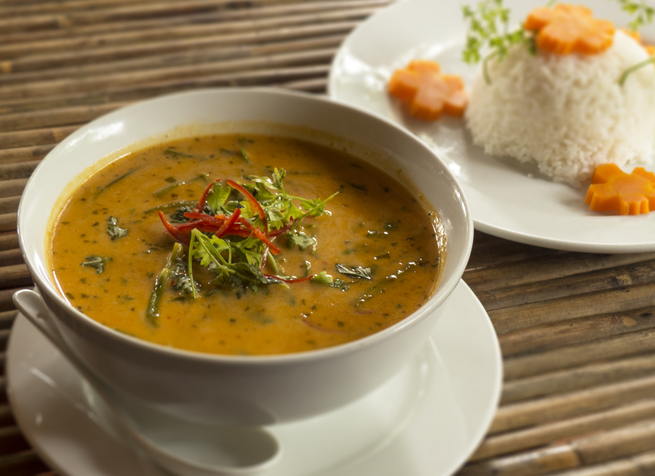 Matchou Slak Maka Sat moan is a coconut based khmer curry. What makes it really special are the herbs from the garden. We have not yet been able to identify what these herbs are. We have never seen or tasted them before but the flavor added to the curry is earthy and subtle. This curry contains chicken and morning glory as well. It is not possible to stop eating this once you taste it.