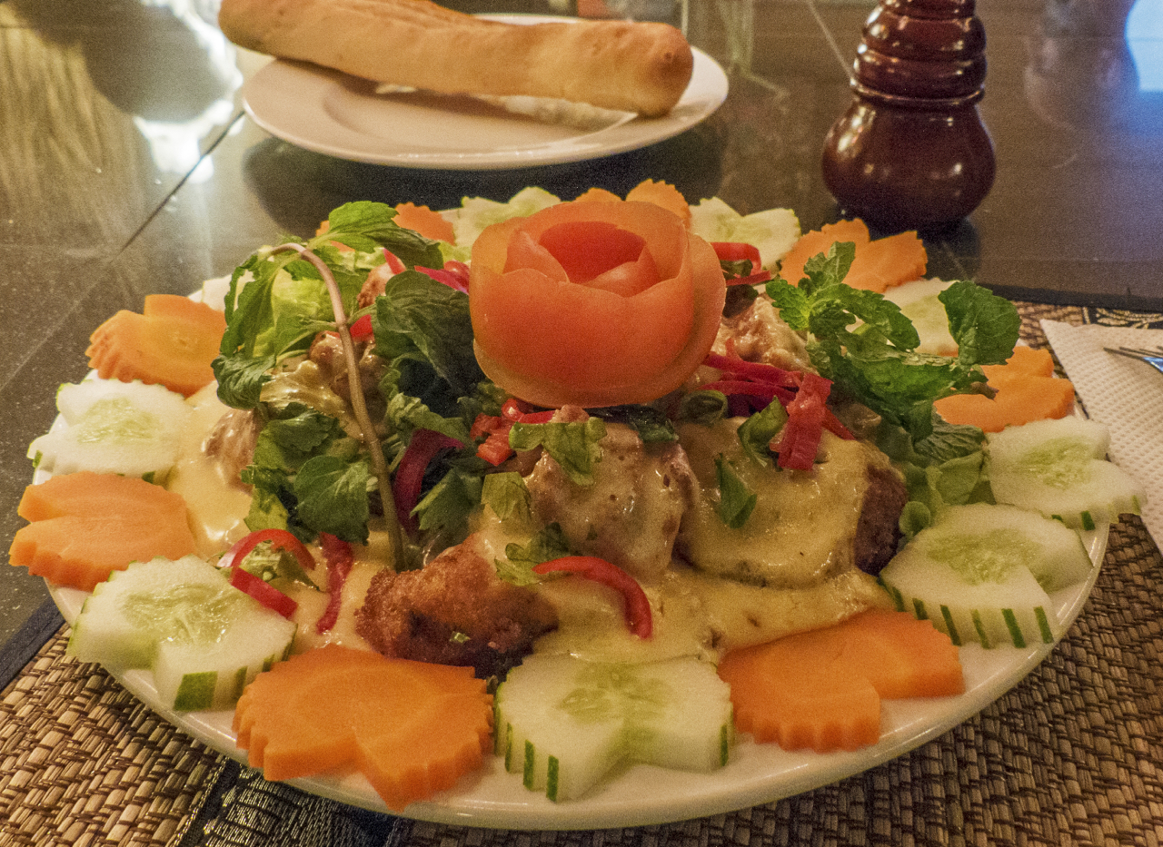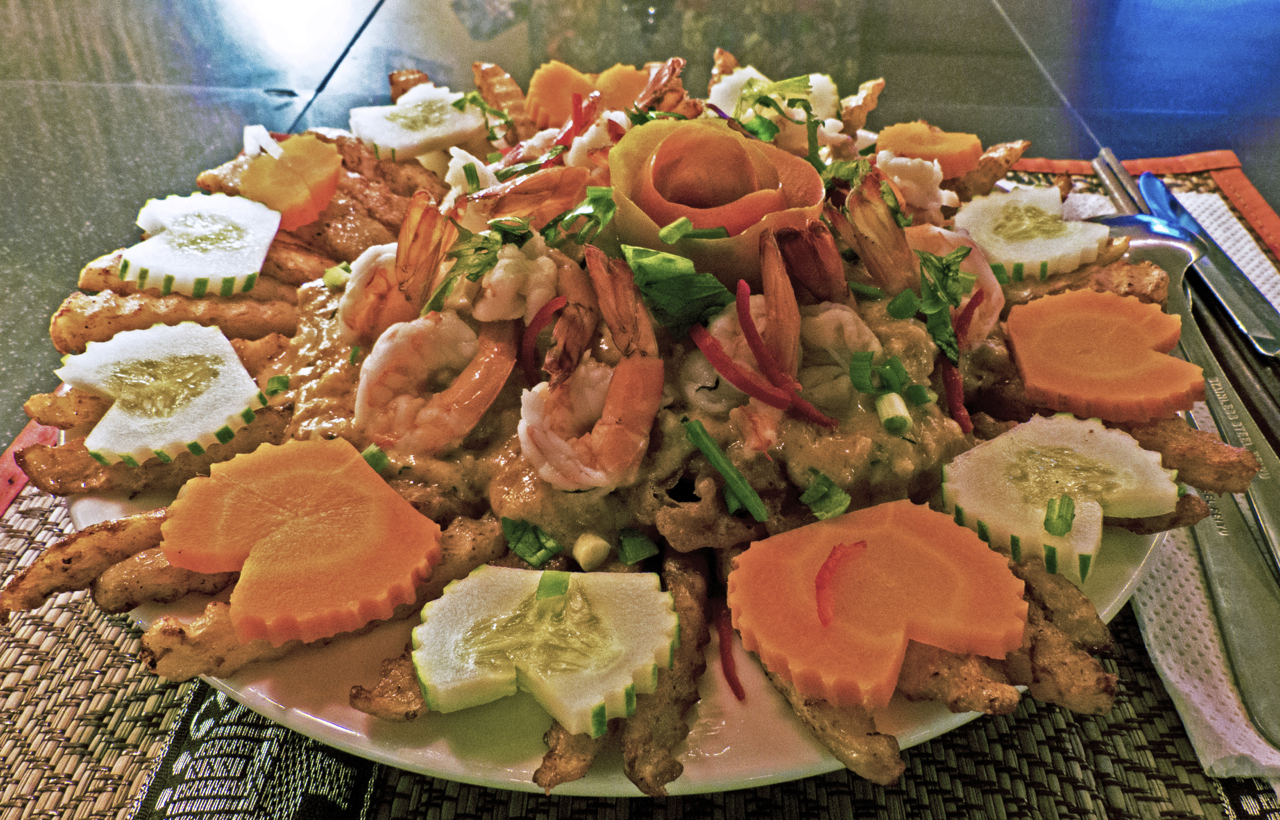 The most surprising and perhaps our favorite meal was Shrimp over Glass Noodles. What is a glass noodle? We are still trying to figure out how they do it. They are crispy rice noodles. Over the top is sweet chili sauce, peanuts, shrimp, and herbs. It is a sweet dish but it’s so much fun to crunch on those crisp noodles in that wonderful sauce.