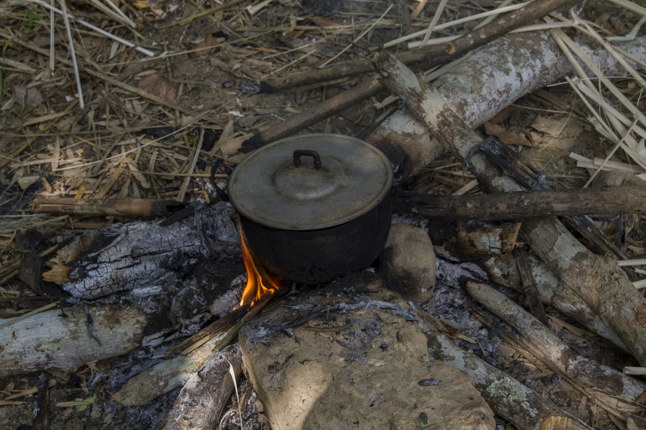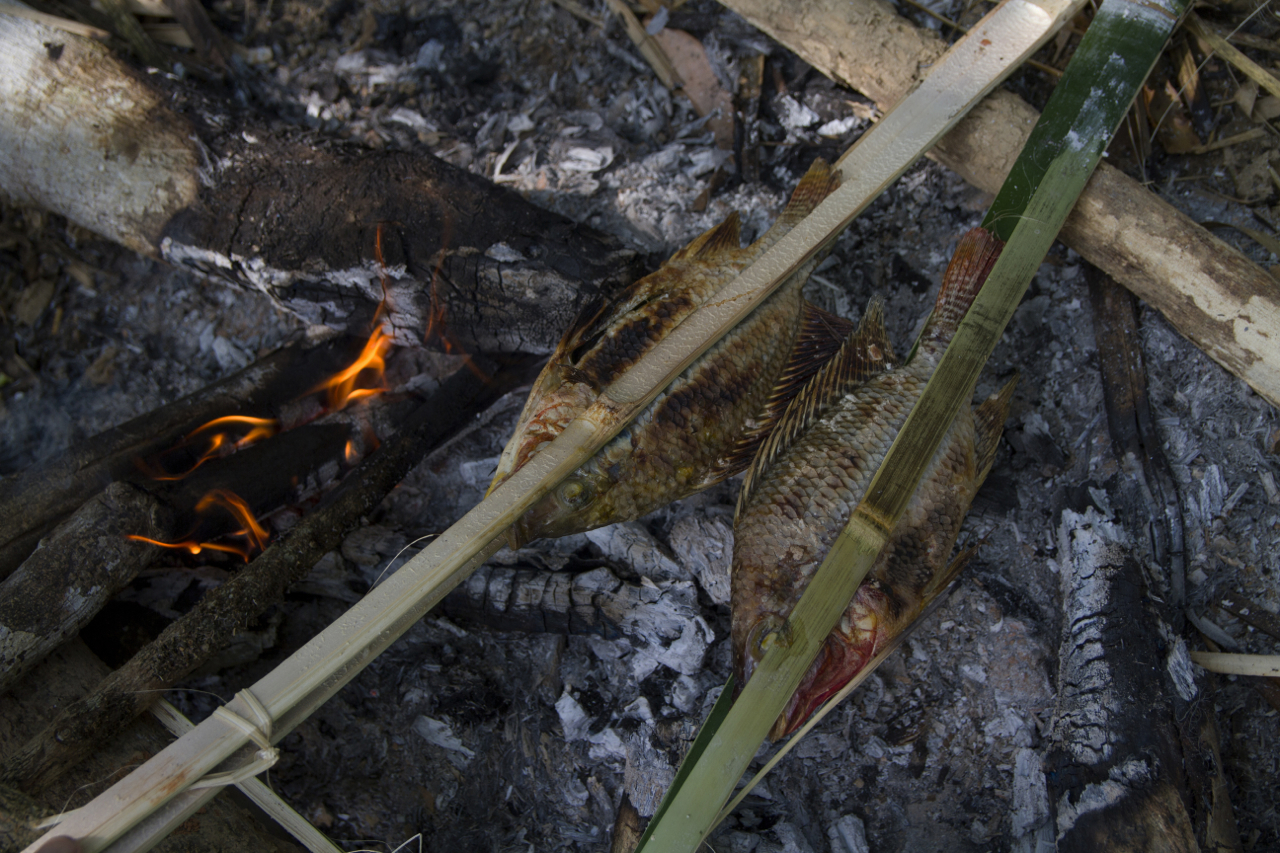 Mr Mang and Mr Lah cooked our lunch for us. Some of our fish was cooked in a soup and some barbecued. The fire was started with bamboo wood and dried leaves that were laying around. Fresh bamboo was cut and used to hold the barbecued fish over the fire. Mang wandered through the nearby jungle and gathered wild coriander, wild peppers, and another leaf that is slightly bitter to season the soup. Add a little bit of salt and you have fantastic tasting soup!