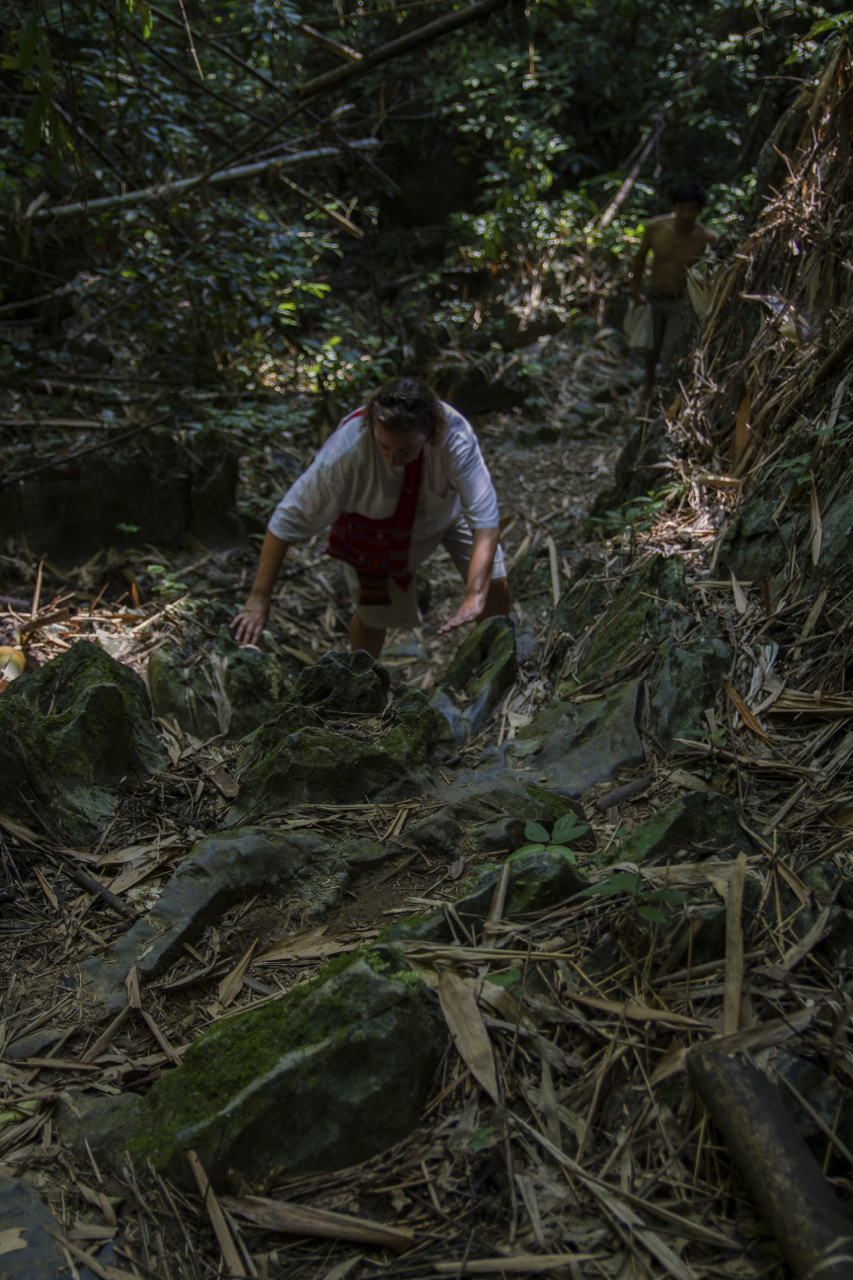 We took the boat a little bit down the river and started our second hike. It was a tough one as we had to climb over a jungle covered mountain to the valley full of rice fields on the other side. The local people hike this path frequently.