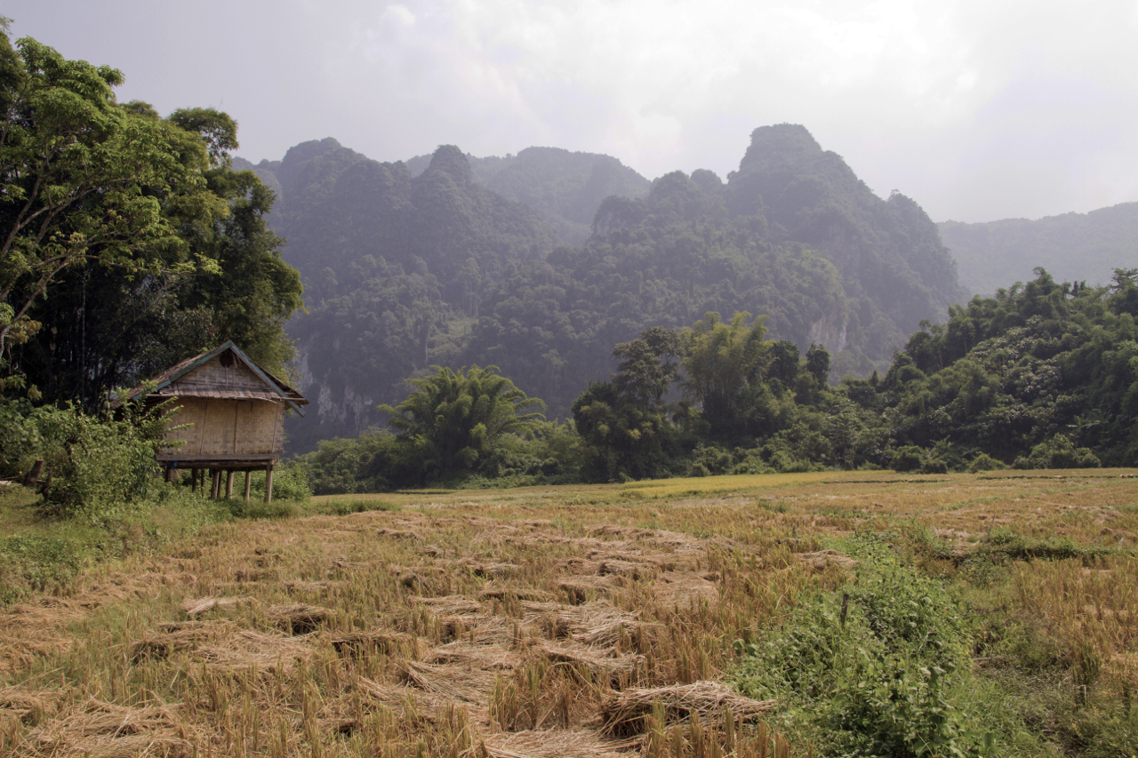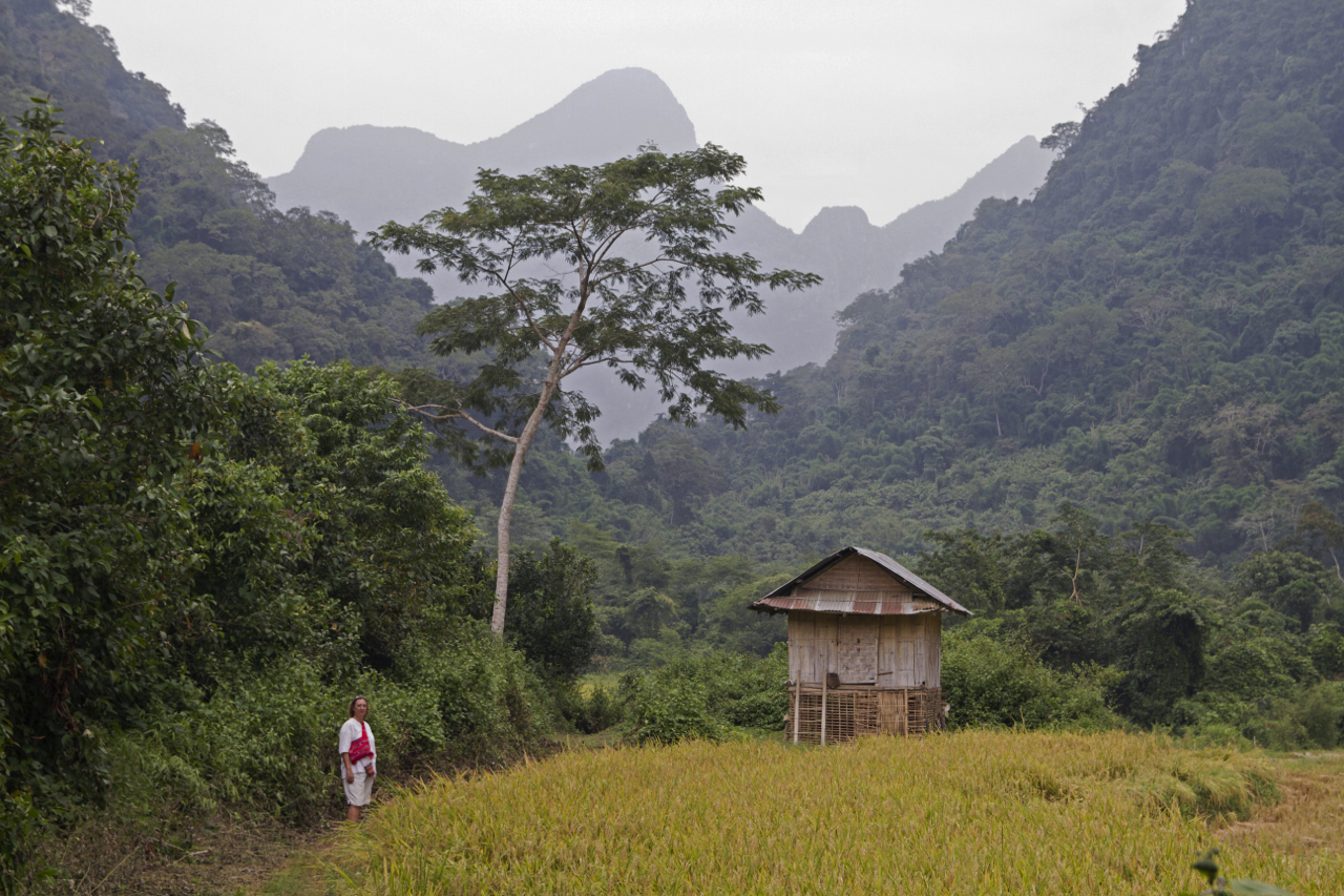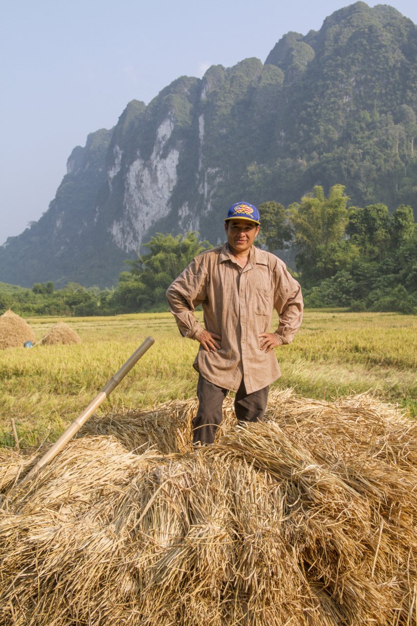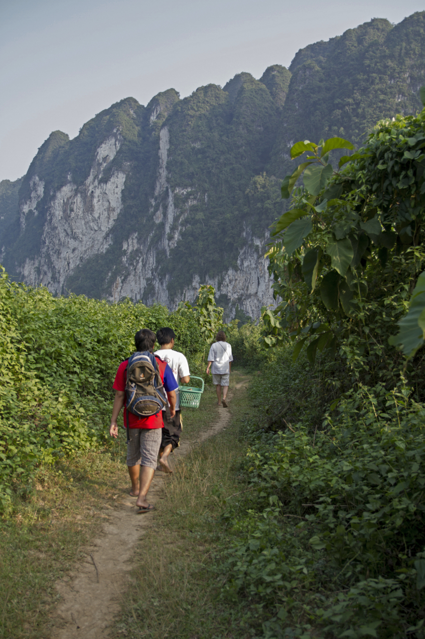 The hike to the rice fields was an easy one, about an hour and a 1/2 long, and mostly flat. The trail took us along the edge of tall cliffs and next to the dense jungle growing against them. As we walked along we could see caves and openings in the limestone above us. Mr Mang told us that the older people in the village still remember the days when the United Staes bombers used to fly low through this valley. It was heavily bombed as it was a path to the Vietcong. The villagers used to hide in the caves and had to manage the rice fields at night in order to avoid being seen by the bombers. In the jungle to our left remain many unexploded ordinance (UXO) from that time. The locals do not make the rice fields now in that part of the jungle. The rice fields that are currently being cultivated have been cleaned by the UXO organization of Laos. Mr Mang said that they came with metal detectors and where ever they found a bomb they detonated it. It seemed surreal to know that we were passing so close to the horrific remains of that war and that the local people still live with them on a daily basis.