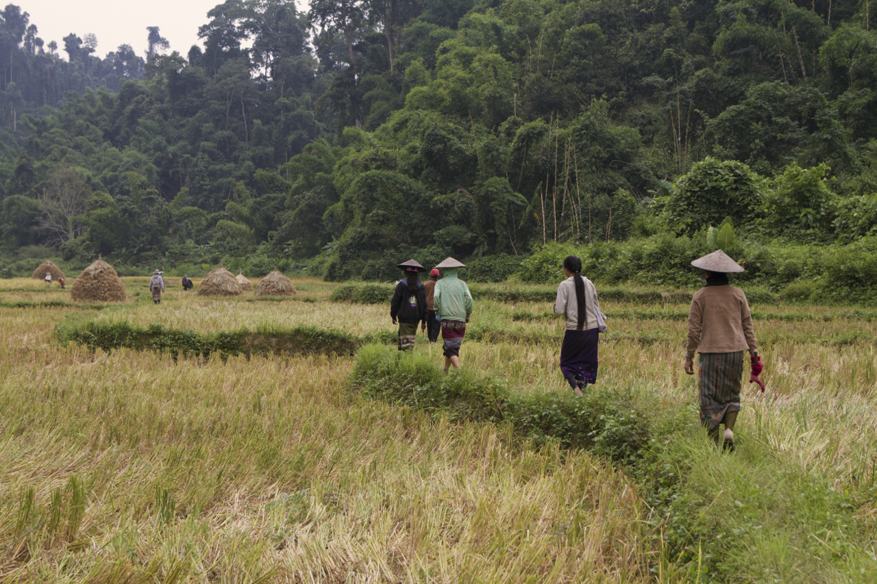 The sun was heading down toward the horizon but the workers continued their harvest as Michel and I head back toward the village with Mr Mang and Mr Lah.