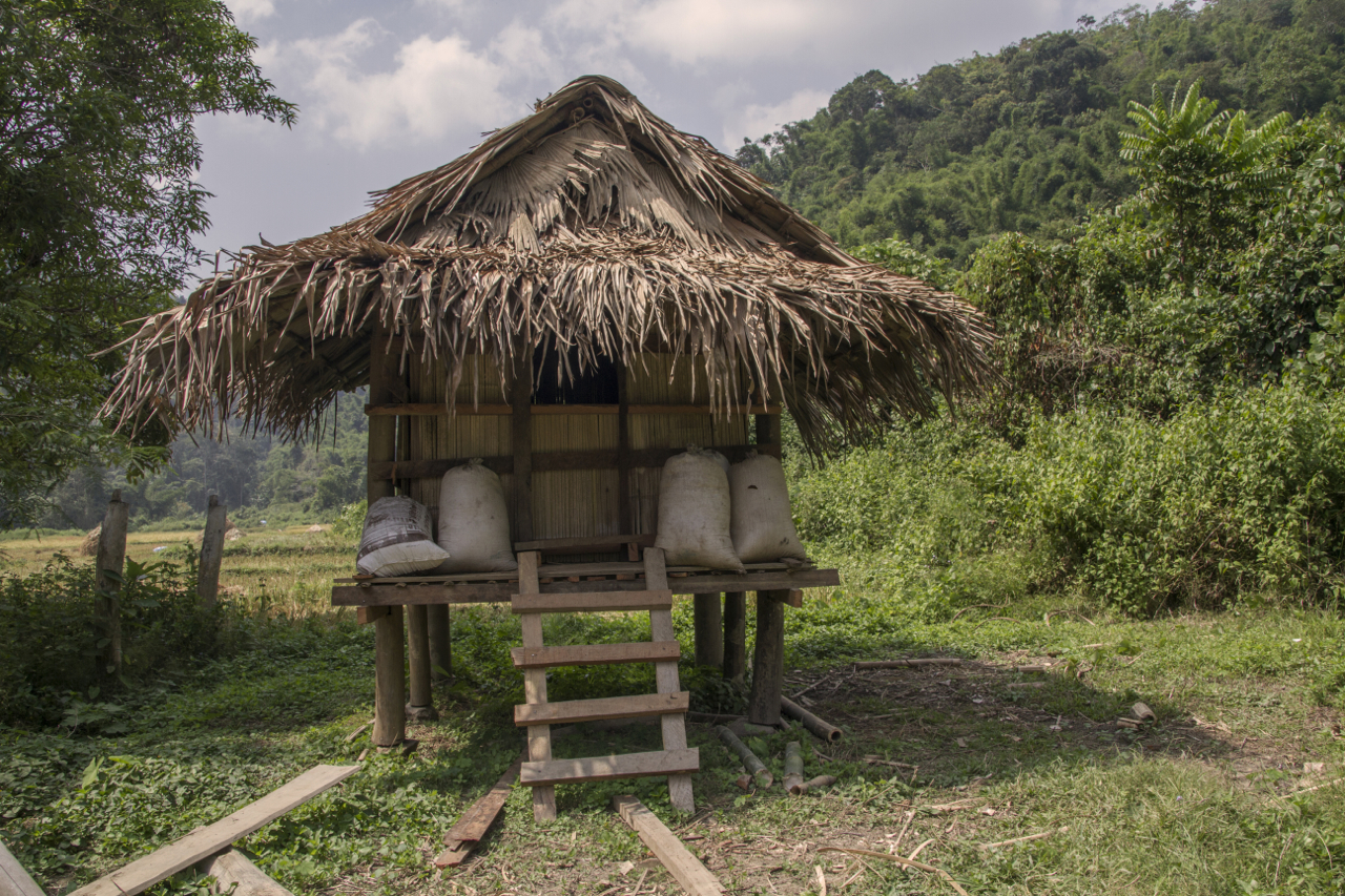 Heavy bags of rice, hut is for storing rice with posts on rocks