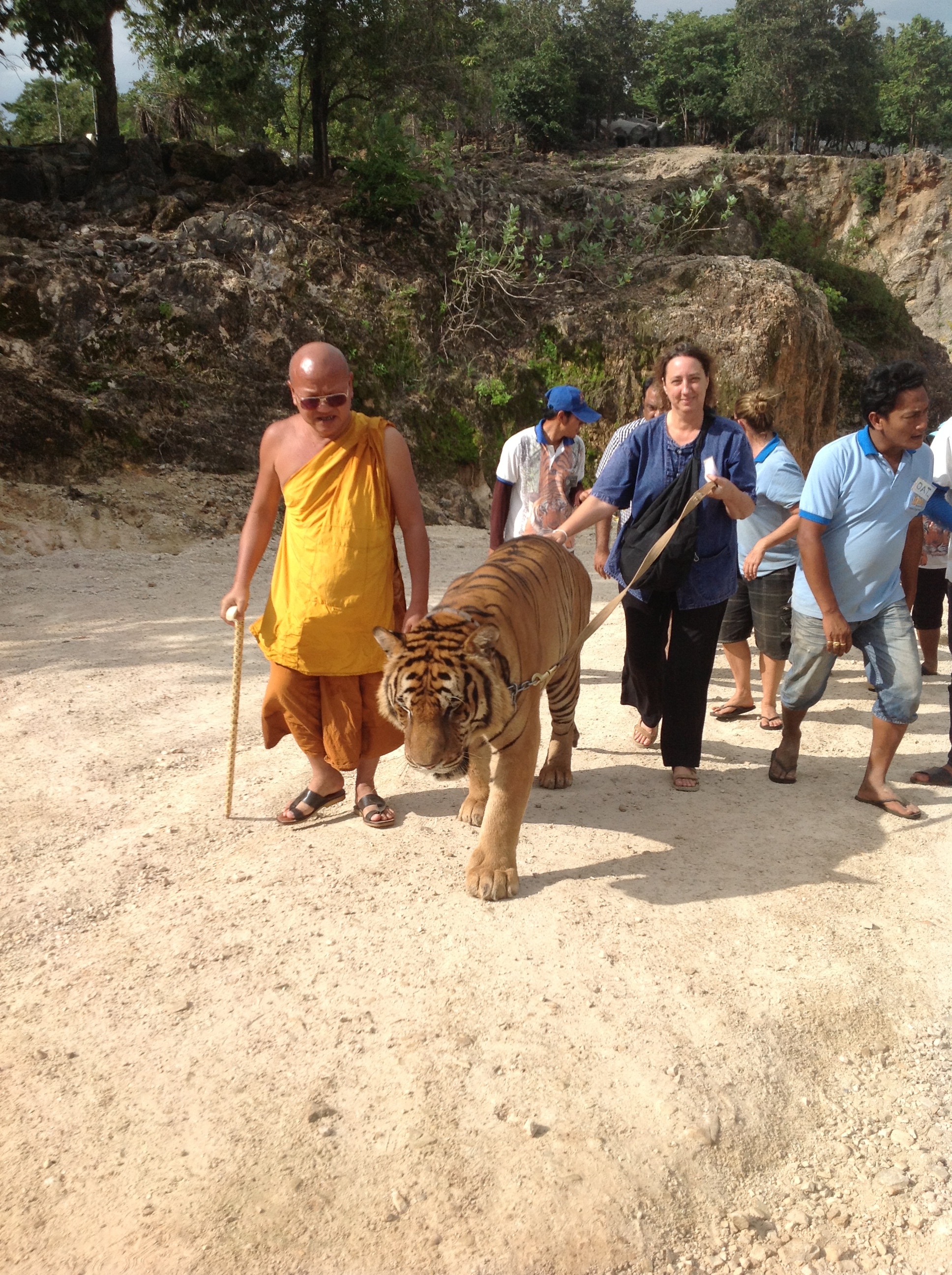 Years ago the locals brought an injured baby tiger to the monks at the temple. Over time many more tigers were brought. This was the beginning of what is now the Tiger Temple. It seems that over the years the temple has been taken over by professional animal handlers and voluteers. There is a contingent of local handlers as well and I assume they have been trained by the Ex-pat handlers that I met. Monks are still involved but there are only 3 of them left who handle the tigers. In particular, I had a long conversation with a gentleman from Canada who had been working with the tigers for (if memory is correct) 4 years. During my conversation with him I noted that he was a little bit defensive about some comments animal activitists were making that implied the tigers at the temple are drugged. He emphatically denied that any of cats are drugged and I believe him. The Tigers that I met were happy and sleeping in the hot humid air. Very similar to my own sleepy domestic cat back in florida who literaly sleeps 18 hours a day. I also observed that when excersize time came all of the big cats were alert and ready to play. They could never have been so if drugged.