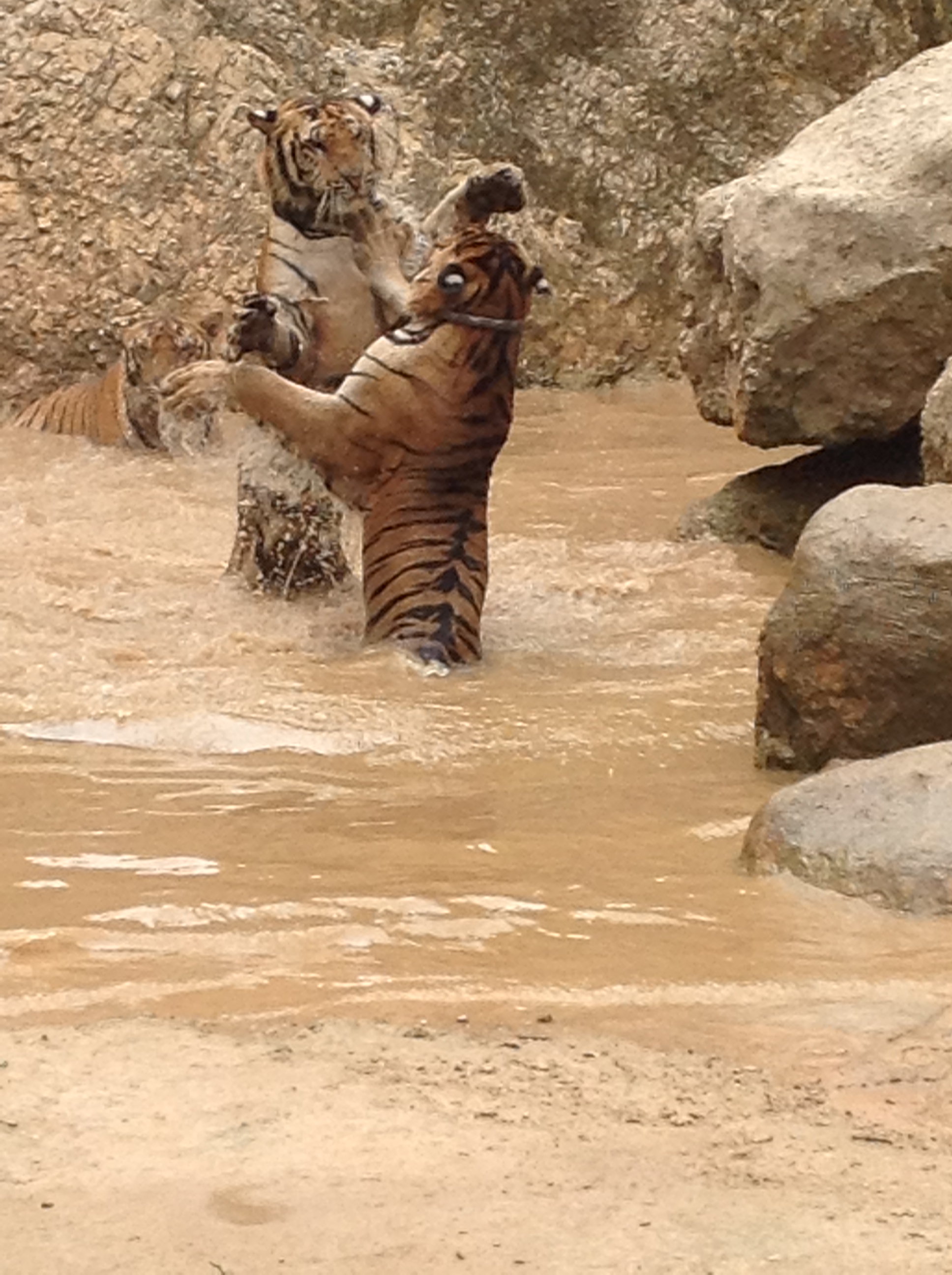 A small group of us (costs extra) were allowed to stay behind after the park closed and watch the tigers being excersized. How do you excersize a tiger? Same way as my cat back home; bring out a brightly colored toy that makes noise and wave it around. These big cats like to play in water and if I could I would have joined them as the temps were in the 90s.